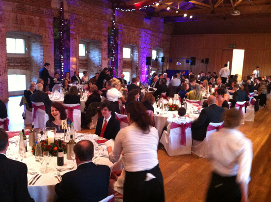The main room at Ickworth is a large space with a mezzanine level and an impressive vaulted ceiling. It has a mixed history, including time as a grain store so it’s great that it’s been reclaimed for more memorable purposes! I set up our uplights between the windows along the wall behind the head table, which looked pretty good – well placed uplights can make brickwork look really cool.