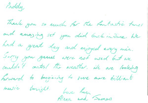 Paddy, Thank you so much for the fantastic tunes and amazing set you did back in June. We had a great day and enjoyed every min. Sorry your games were not used but we couldn't control the weather. We are looking forward to boogieing to some more brilliant music tonight. Love from Alexa and James