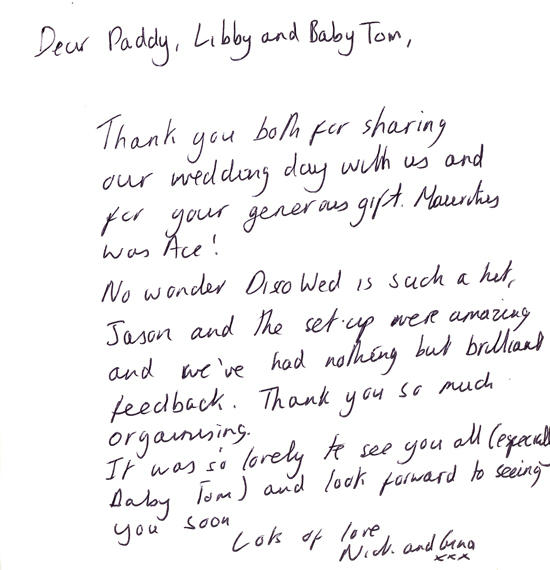 Dear Paddy, Libby and Baby Tom, No wonder Disco Wed is such a hit, Jason and the set-up were amazing and we've had nothing but brilliant feedback. Thank you so much for organising. Lots of love, Nick & Gina x
